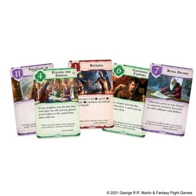 Manipuler den sammenfiltrede politik i King’s Landing I dette hurtige kortspil til 3-6 spillere fører du dit hus som en af ni ikoniske konspirerende figurer fra Song of Ice and Fire-serien. Brug din indflydelse til at tiltrække nye allierede og omhyggeligt navigere de andre spillers troskab, når du stræber efter at have det mest magtfulde lille råd i Westeros. Men nogle allierede deles mellem dig og din nabo, så pas på – selv dine nærmeste ledsagere har andre loyaliteter!