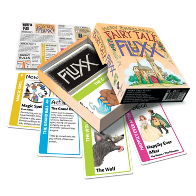 Eventyr Fluxx, illustreret af den anerkendte folkekunstner Mary Engelbreit, bringer zaniness af “Kortspilet med stadig skiftende regler” til landet “Happily Ever After”, og resultaterne er egnede til en konge! Saml holderne, så de passer til det aktuelle eventyrmål, og du vinder – men kig efter heksen og ulven!