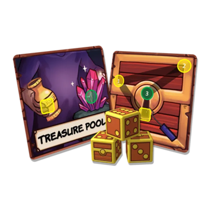 - Inkluderer 4 trykte skattekiste Terninger og et specielt spilkort