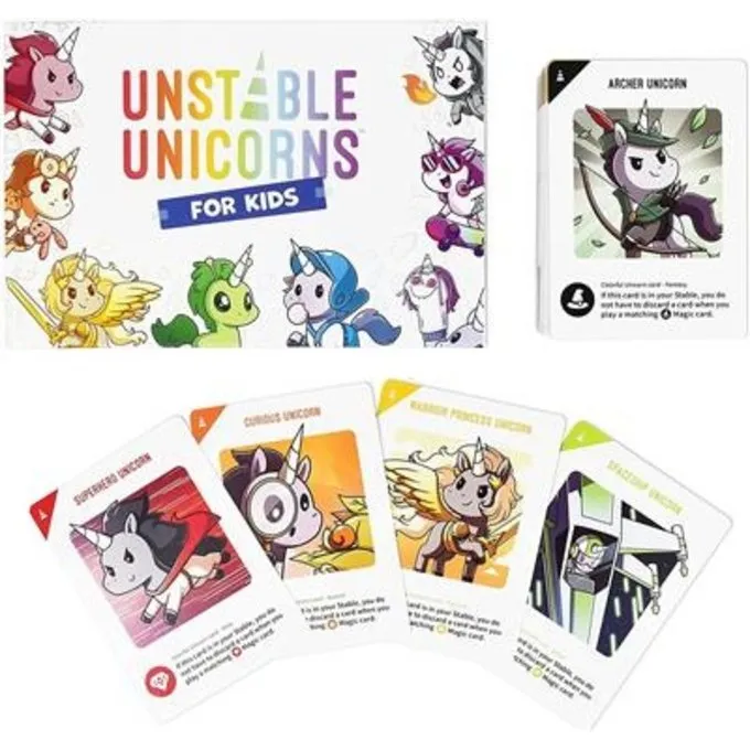 Ustabile enhjørninger til børn har helt nye kunstværker, kort og karakterer til at glæde de mindste spillere. Og det er også sjovt for forældre! Spillet indeholder otte farverige enhjørningskorttemaer, herunder helt, dyr, prinsesse, rum, sport, klodset, regnbue og fantasi. Med kort som Sock Puppet Unicorn, Astronaut Unicorn og Mermaid Princess Unicorn er der en unik enhjørning (en unikel, hvis du vil) for alle!