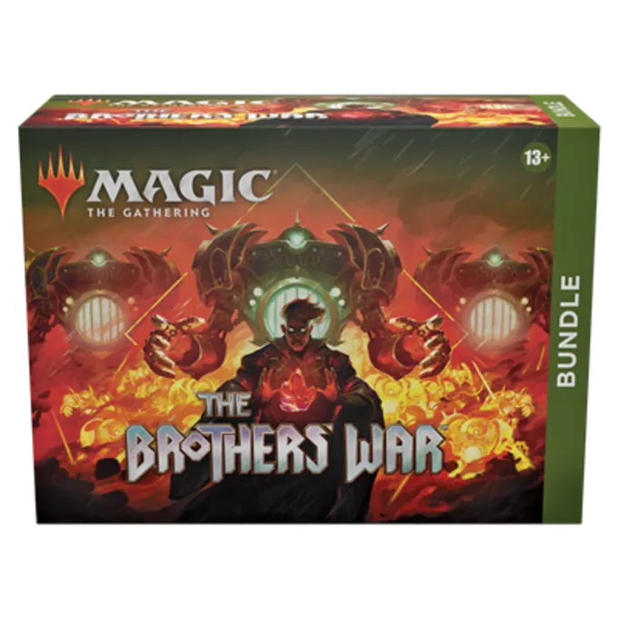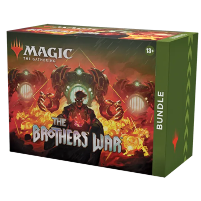 Brødrenes krigsbundt indeholder 8 Brothers ‘War Set Boosters – de bedste boostere til at åbne bare for sjov – plus eksklusivt tilbehør, med 40 Grundlæggende lande (20 traditionelle folier og 20 ikke-filer), 1 traditionelt foliepromo-kort med bundteksklusiv alternativ kunst, 1 overdimensioneret spindown-livstæller (rød eller grøn), 1 kortopbevaringsboks og 2 referencekort.