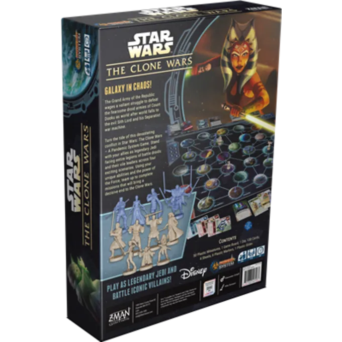 “I Star Wars: Clone Wars – et pandemisk systemspil, spiller spillerne blandt syv Jedi, inklusive Ahsoka Tano og Anakin Skywalker, hver med deres egne unikke kraftevner. På tværs af fire episke scenarier skal Jedi slå sig sammen og besejre et medlem af Den